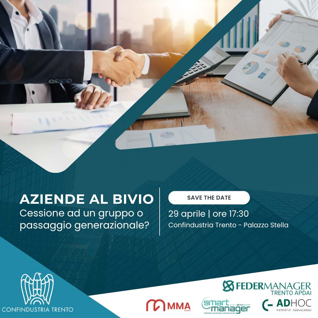 Un incontro dedicato a uno dei momenti più delicati nella vita di un’impresa: la scelta su come proseguire il proprio percorso. Durante l’evento verranno analizzate le principali opzioni strategiche – cessione a un gruppo, passaggio generazionale e temporary management – con l’obiettivo di offrire spunti concreti e strumenti utili per affrontare questa fase con maggiore consapevolezza.
