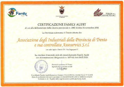 Dal 2013 Confindustria Trento è certificata “Family Audit”: uno standard nazionale che aiuta le organizzazioni a promuovere politiche di gestione del personale orientate al benessere dei propri dipendenti e delle loro famiglie, nonché alla crescita aziendale per le politiche di conciliazione famiglia-lavoro.