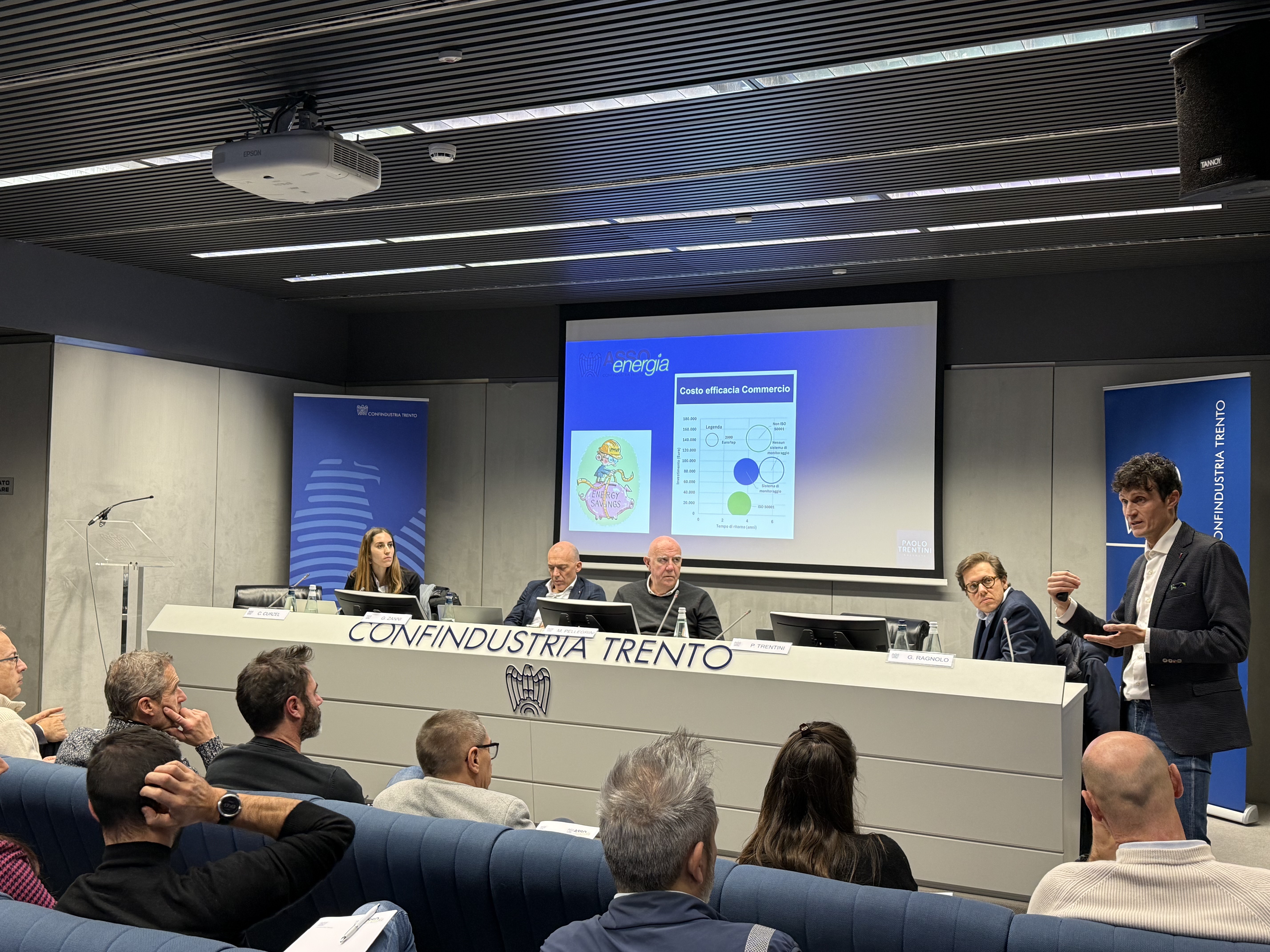 A seguire, Chiara Curzel, referente tecnico del Consorzio, ha illustrato l’andamento dei mercati energetici e le previsioni per il 2026 che vedono un mercato ribassista per il gas naturale e un mercato stabile attorno ai valori attuali per l’energia elettrica. Successivamente Gianmaria Zanni, energy manager di AFV Acciaierie Beltrame e consulente decennale del Consorzio ha approfondito il ruolo dei sistemi di accumulo (BESS), sottolineandone il valore in termini di flessibilità e ottimizzazione dei costi. Paolo Trentini, ingegnere libero professionista e collaboratore del Consorzio, ha poi richiamato l’attenzione sugli obblighi relativi alla diagnosi energetica e al monitoraggio, ricordando al contempo le opportunità di risparmio ottenibili adempiendo a tali obblighi. In chiusura, Gianmarco Ragnolo di Dolomiti Energia ha presentato i principali strumenti incentivanti accessibili alle imprese. Tra questi è stata ricordata la legge provinciale n. 6/23, il decreto CACER, i Certificati Bianchi e il Conto Termico 3.0 che entrerà in vigore nel 2026.